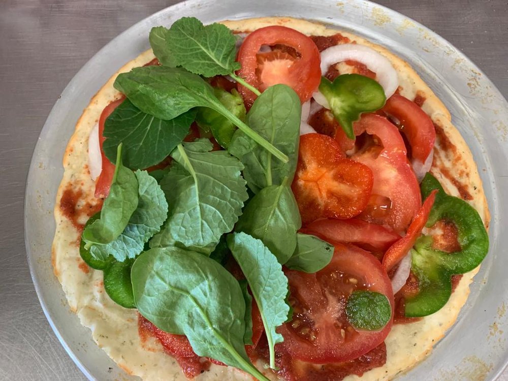 Tomato, onion, green pepper, mushroom, black or green olives.This seasoned cauliflower pizza crust delivers a flavorful, fun, and fancy pizza experience to our customers. Crust Ingredients: Cauliflower, Low Moisture Mozzarella Cheese (pasteurized Milk, Cheese Cultures, Salt, Enzyme), Tapioca Starch, Rice Flour, Rice Starch, Egg Whites, Modified Rice Starch, Cane Sugar, Yeast, Salt, Garlic Powder, Spices, Xanthan Gum, Cultured Brown Rice, Brown Rice Flour, Citric Acid, Lactic Acid.